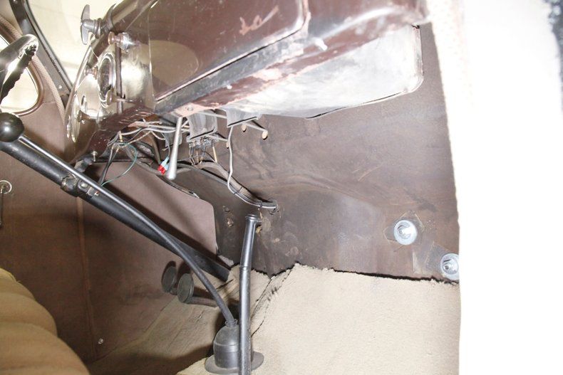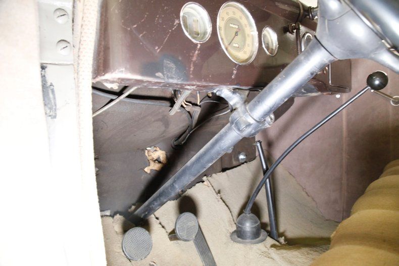Inside some TLC will be required as we note solid stitched lined door panels which remain in overall good condition. Original cranks and actuators are on and appear in shiny condition. Inside more silk tufted and tucked and wide rolled seats have several areas of moth damage. The seats retain their original shape and are still solid and not saggy. This holds true for the rear bench as well. Tan medium pile carpeting is on the floors and the long armed shifter rises from the front central hump. The dash is full metal jacket, painted brown and is very simply adorned with warm cream colored round sweep gauges that are wonderfully vintage. This also holds true for the large round bakelite steering wheel with another V8 central badge. Above a mohair headliner is still tight and shows a little aging and fading, but with no real obvious faults with this field.