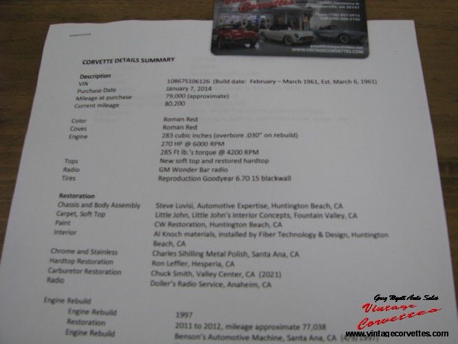 Roman Red, Black Interior, Black Soft top, All Correct Matching Numbers 283-270hp, 4 Speed, Posi Rear, Heater, Radio, Both Tops, 270hp Engine, Black wall Tires-White wall tires can be added, Complete Frame off restored to show condition, All Numbers Brake down sheet, Restoration receipts and some Photos, California car same owner for 12 Years, Nice body fits, nice frame, one of the best 1961 Red Corvettes 270hp cars offered for sale today, Drive or Show!