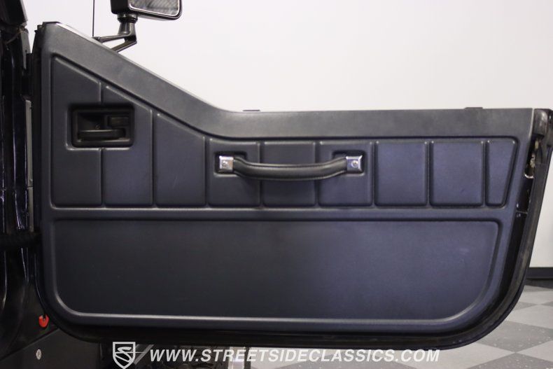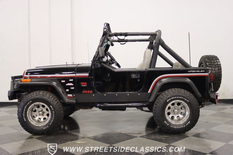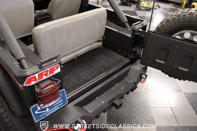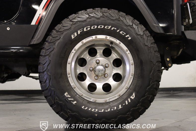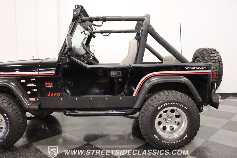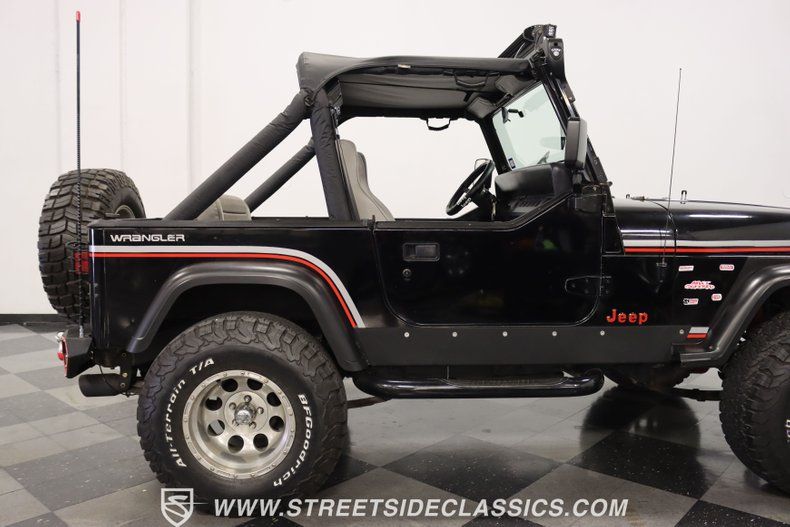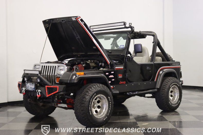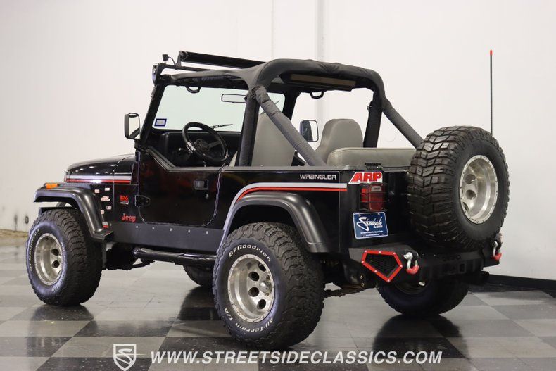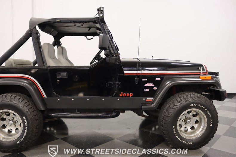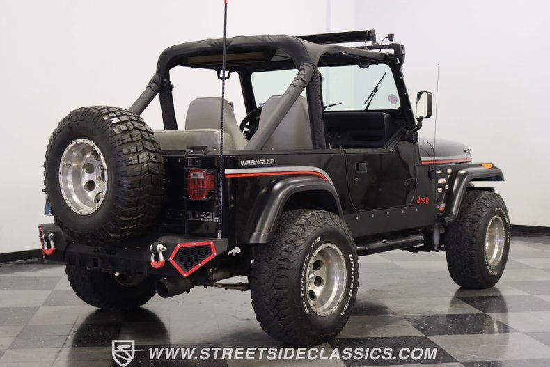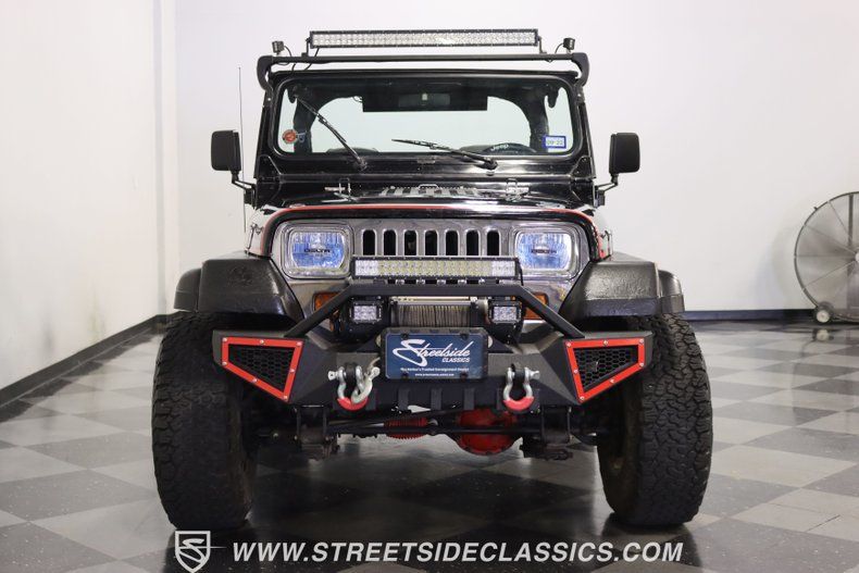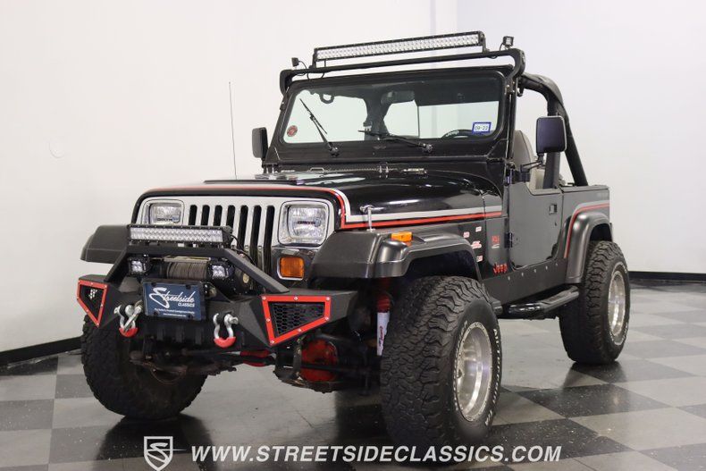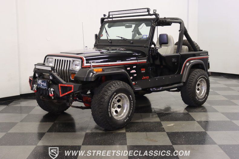 With a trail-ready look, and the right upgrades to back it up, this 1991 Jeep Wrangler is a 4x4 that delivers both style AND substance. You know this Wrangler means business the moment you lay eyes on it. This puts a mean face forward with the upgraded bumper that includes integrated tow hooks and a winch. Plus, you'll notice enough LEDs to basically turn night into day. The sides have rugged fender flares, rock sliders, and tubular side steps all in black. The rear is also upgraded with a beefy bumper that includes tow hooks and a trailer hitch. So this is unmistakably an adventurer, but there's also another side to this Wrangler. The black paint looks nice, and the red and silver stripes add a touch of class. There's nothing here that will make you hesitate to have some 4x4 fun, but it's also nice to look impressive rolling through town. The interior continues the look of a thoughtfully packaged adventurer. That's why you have the choice of enclosing in the full soft top or you can just use the new bikini top any time you just want the sunshine off your shoulders. More of this useful packaging includes good padding on the roll bar, removable half doors, and new Bestop front seats. There are nice upgrades like an AM/FM/CD stereo with USB input, a separate Bluetooth soundbar, auxiliary USB plugs, a CB radio, and a lockbox center console with cup holders. This is also a nice driver with the classic Jeep steering wheel on a tilt column, a nice action to the five-speed's tall shifter, and one of the best gauge layouts around for giving you clear info about what's going on in the engine bay. Under the hood is the correct-style 4.0-liter motor. It remains honest with just nice investments in newer pieces like the seals, sensors, and a cold air intake. And we like it when they are quite stock because this inline-six was derived from the tough-as-nails AMC line of motors, and the fuel injection adds to the durability and economy. It fires up readily, runs confidently, and shifts smoothly - so it feels like a hardy Jeep. And the 4x4 ability is enhanced with Rancho shocks, newer driveshafts, and BF Goodrich All-Terrain tires. And because a go-anywhere machine also means time on the city streets, you have good anytime features like power steering, power brakes, and front discs. Complete with service manuals, this is believed to be a life-long Texas Jeep thus far. So if you want the right look and features to take you from the High Country to downtown Dallas, call today!