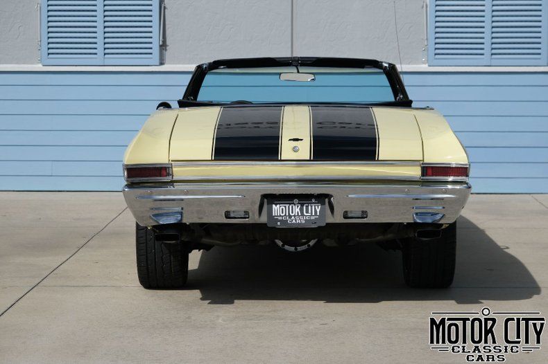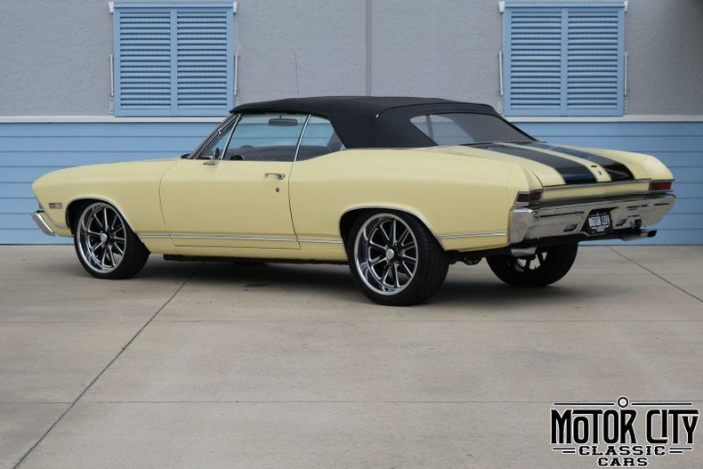 This '68 Chevelle convertible maintains much of its originality in appearance but has been modified slightly to enhance driveability and enjoyment. Around the exterior, the car is presented in its trim tag specified color of butternut yellow and has black rally stripes that are a compliment to the car's black convertible top. The rarely found exterior color makes this Chevelle stand out amongst its peers. Custom 10-spoke wheels correlate with the car's color scheme, adding a bit of a modern touch to the exterior. On the interior, the front and rear bench seats are presented in trim tag indicated black vinyl. Modifications to the interior include B&M shifter tied to an automatic transmission, custom 6-spoke steering wheel and modern stereo head. Powered by a 350ci V8 tied to an automatic transmission, with power steering, dual exhaust and modified suspension, this Chevelle is a fun car to drive. Fire it up and the growl from the dual-exhaust immediately grabs the attention of those around you.