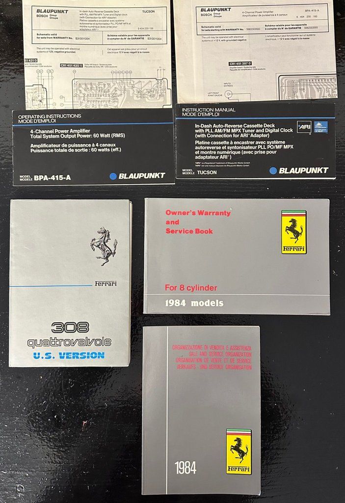 This exceptionally fine original, low mile example is one of the most recognizable and coveted cars ever produced... it is the 1984 Ferrari 308 GTS Quattrovalvole. The "quattrovalvole" part of the name referred to 4 valves per cylinder giving the car increased horsepower, higher refinement and overall performance than the earlier cars. When the Ferrari 308 was introduced in 1975 there was much fanfare around the car as it was highly regarded as a worthy successor of the much loved Dino 246 and its styling is still considered one of the most beautiful cars ever built. According to Sergio Pininfarina, the inspirations for the styling came from the Dino Berlinetta Speciale that was exhibited at Paris in 1965. Road testers and enthusiasts alike hailed the refined performance the car had to offer. Paul Frere summed it up as he began his 1976 Road and Track review "Dino 246 fans, cheer up! There is a worthy 2 seat successor to your favorite car. And it's even better, faster, quieter and more comfortable". The example offered here was sold new at Roger Mauro Imports in Lakewood, CO. Documentation indicates that in 1990 and at 9361 miles, the car made its way to a private collection in Michigan where it continued to be kept in a complete climate controlled environment, used sparingly and consistently looked after. At 11,646 miles, the car had a complete engine out service. On 10-01-14 a timing belt service and tensioners was done at Cauley Ferrari at 11,807 Miles and this documentation is on hand. The most recent completed full service was at mileage of 14,585 ($10,538) also at Cauley Ferrari: Changed oil & filter, air filter, gear lube, replace accessory belts, timing belts & tensioner pulleys, clean engine ground strap, replace valve cover gaskets, cam seals, distributer seals and gaskets, engine & trans pan gaskets, shift rod seals, check valve clearances, replace oil return hose, air intake bellows, spark plugs, hoses on LH coolant pipe, replace dogbone busing on valve RH valve cover, flush brakes, set tires to 34psi, torque wheels to 100Nm before & after road test, lube all hinges & latches, charge AC. Today, the car has just over 15,700 miles and remains outstanding all around mechanically and cosmetically.