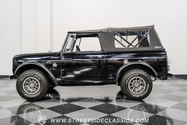 Venturing into the wild, this 1963 International Scout 80 4X4 stands as a monument to American adventure and off-road exploration. Cloaked in imposing black paint, its body is a testament to rugged beauty and functional design. The Hankook Dynapro AT2 tires, sized at 31X10.50R15, are ready to tackle any terrain, mounted on Billet Specialties rims that blend durability with a touch of elegance. In a very desirable level of style choices that we don't usually see, you have a few options... The newer soft top can cover you and your cargo or friends on the rear bench seats while the hardtop gives you a cool short bed pickup profile. But probably the way most people will love this truck is as a full convertible with no roof at all. Your choice!